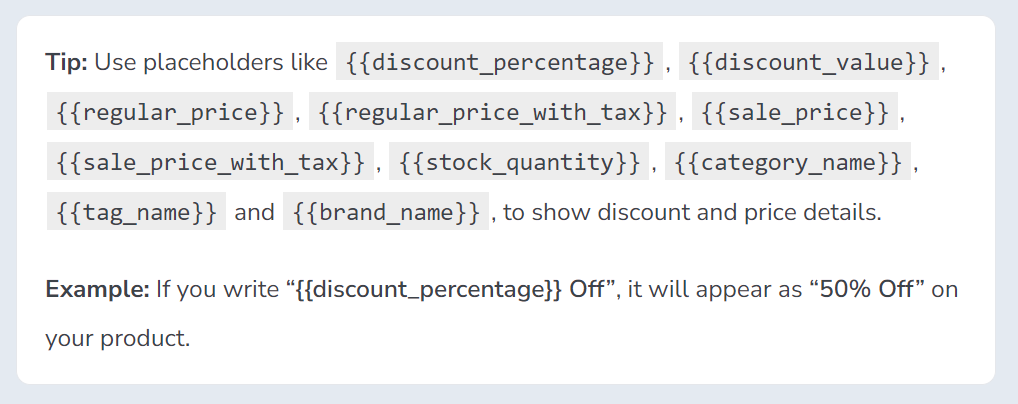 | Dynamic Placeholders (price, discount, category, tag, brand, tax) | ||